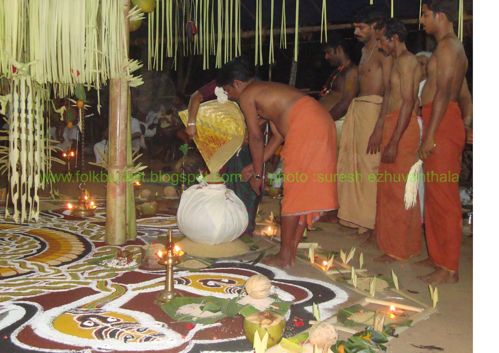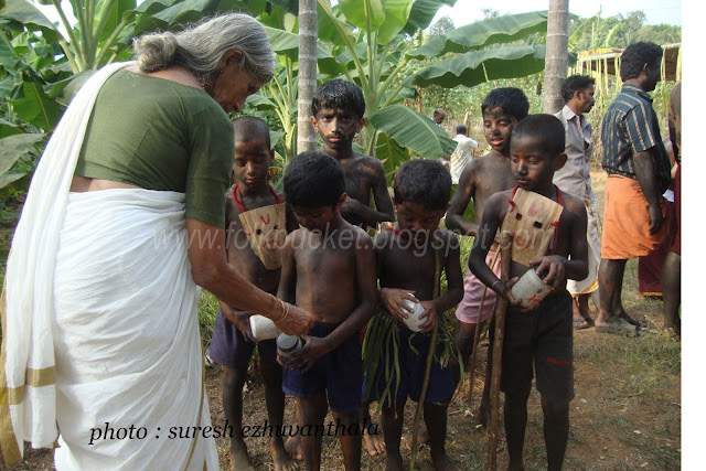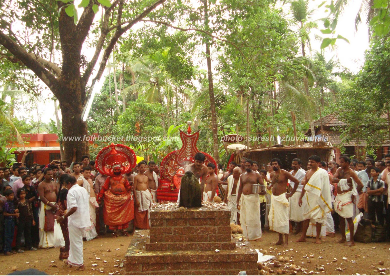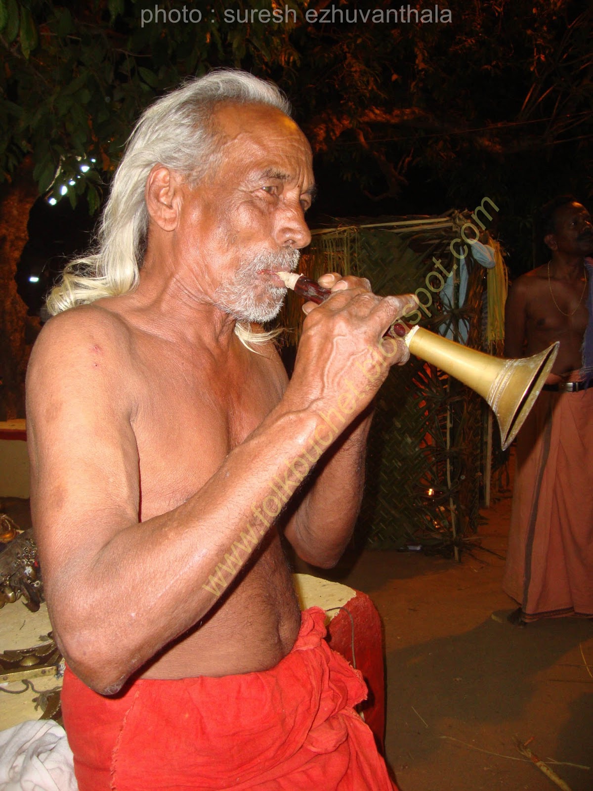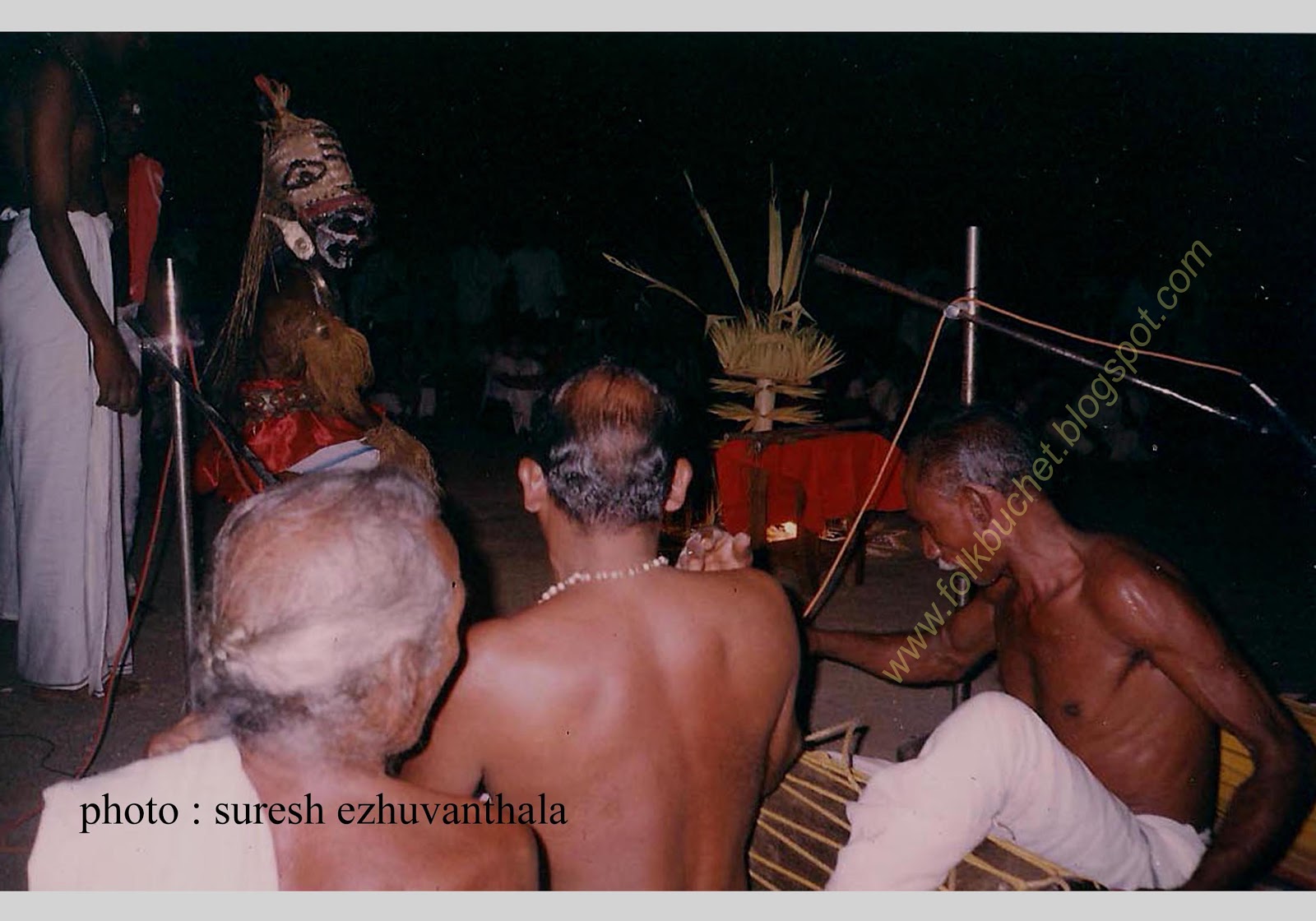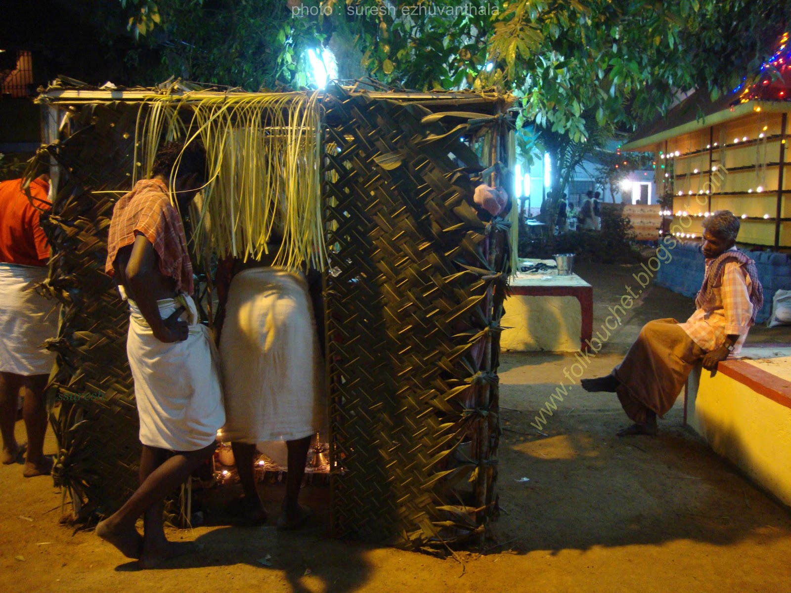 | Kesavan (Folk lore Award winner,belongs PULLUVA Community,lives in KULUKKALLUR,near Pattambi,Palakkad Dt)sitting infront of SANTHANAKKALAM |